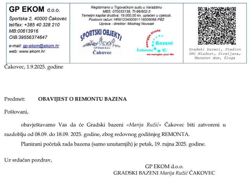 Poštovani,obavještavamo Vas da će Gradski bazeni «Marija Ružić» Čakovec biti zatvoreni urazdoblju od 08.09. do 18.09. 2025. godine, zbog redovnog godišnjeg REMONTA. Planirani početak rada bazena (samo unutarnjih) je petak, 19. rujna 2025. godine.Uz srdačan pozdrav, GP EKOM d.o.o. GRADSKI BAZENI Marija Ružić ČAKOVEC